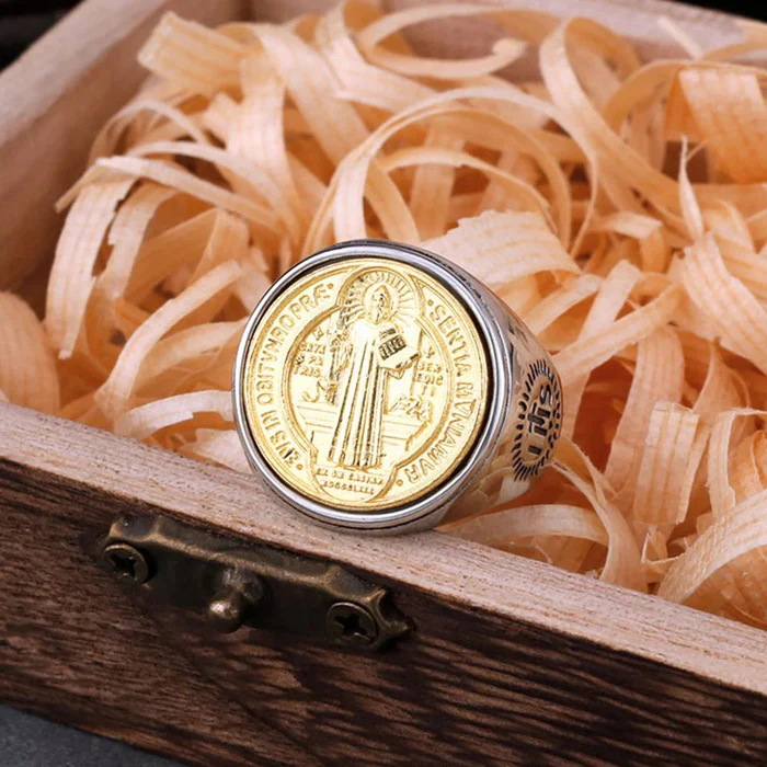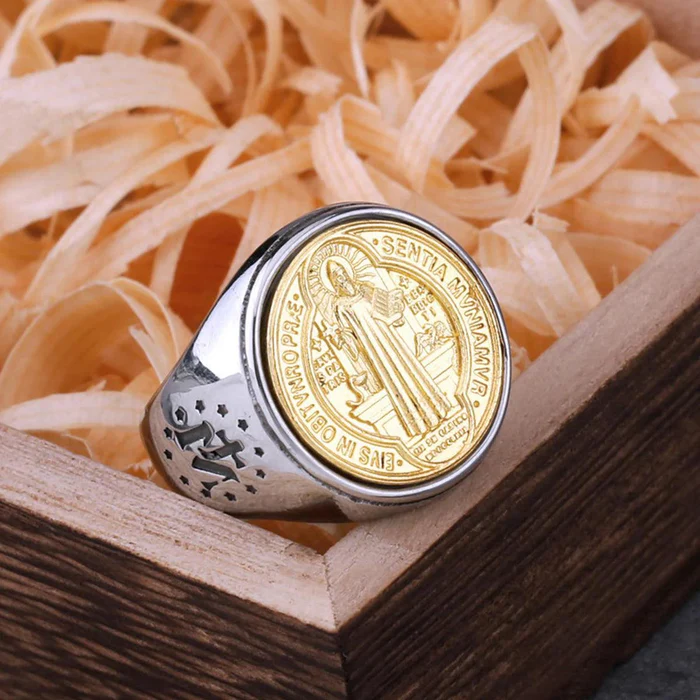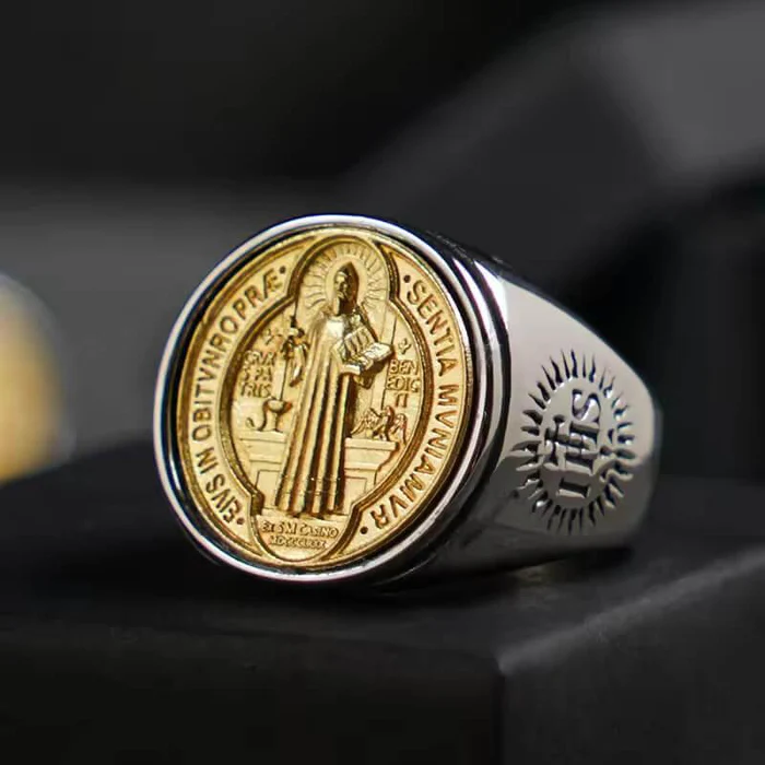 A medalha de São Bento é uma das insígnias cristãs mais antigas e reverenciadas. Conhecida também como a “medalha do perseguidor do diabo” devido à crença em seu poder de afastar o mal, a sua origem remonta ao século XI. Inicialmente, a medalha pode ter sido apresentada na forma da cruz de São Bento e foi utilizada pelo papa Leão IX. No verso da medalha, encontra-se a inscrição “Vade retro satana” (“Vá embora, Satanás!”), uma fórmula que tem sido usada pelos cristãos para afastar o mal desde o século XV. A medalha pode ser carregada individualmente ou como parte de um rosário, servindo como um poderoso símbolo de fé e proteção.